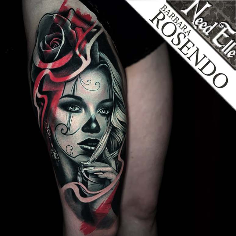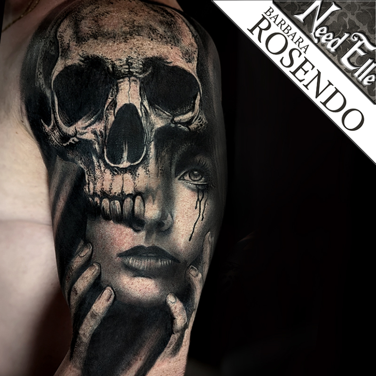 IUn double portrait skull/femme par Barbara ROSENDO, spécilaiste du tatouage réaliste.