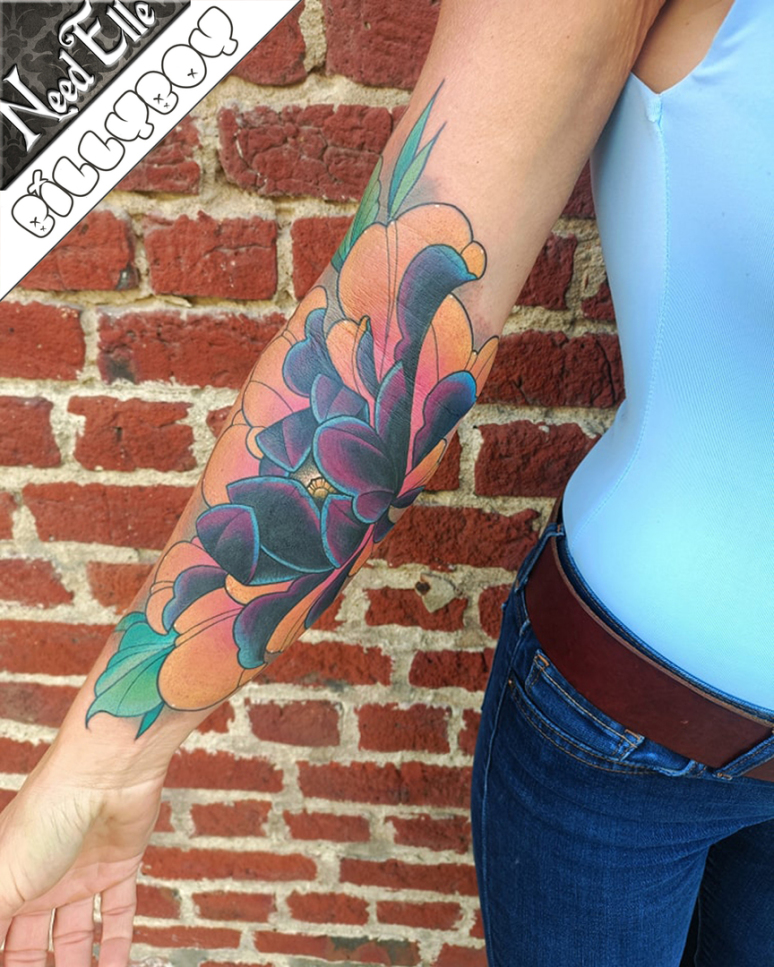 Il y a un vieux tatouage sous cette magnifique fleur par BILLYBOY, mais ce n'est même plus la peine d'en parler quand le recouvrement est réussi.