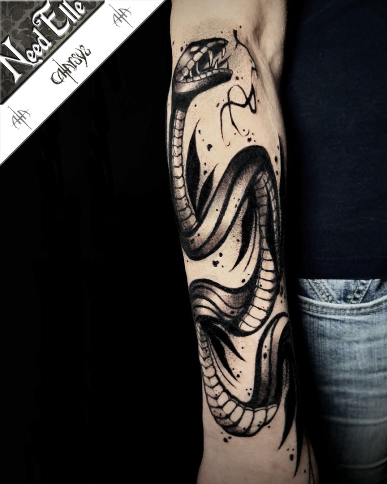 Un seprent tatoué sur le bras dans le style Dark Graphic de CATARSYS
